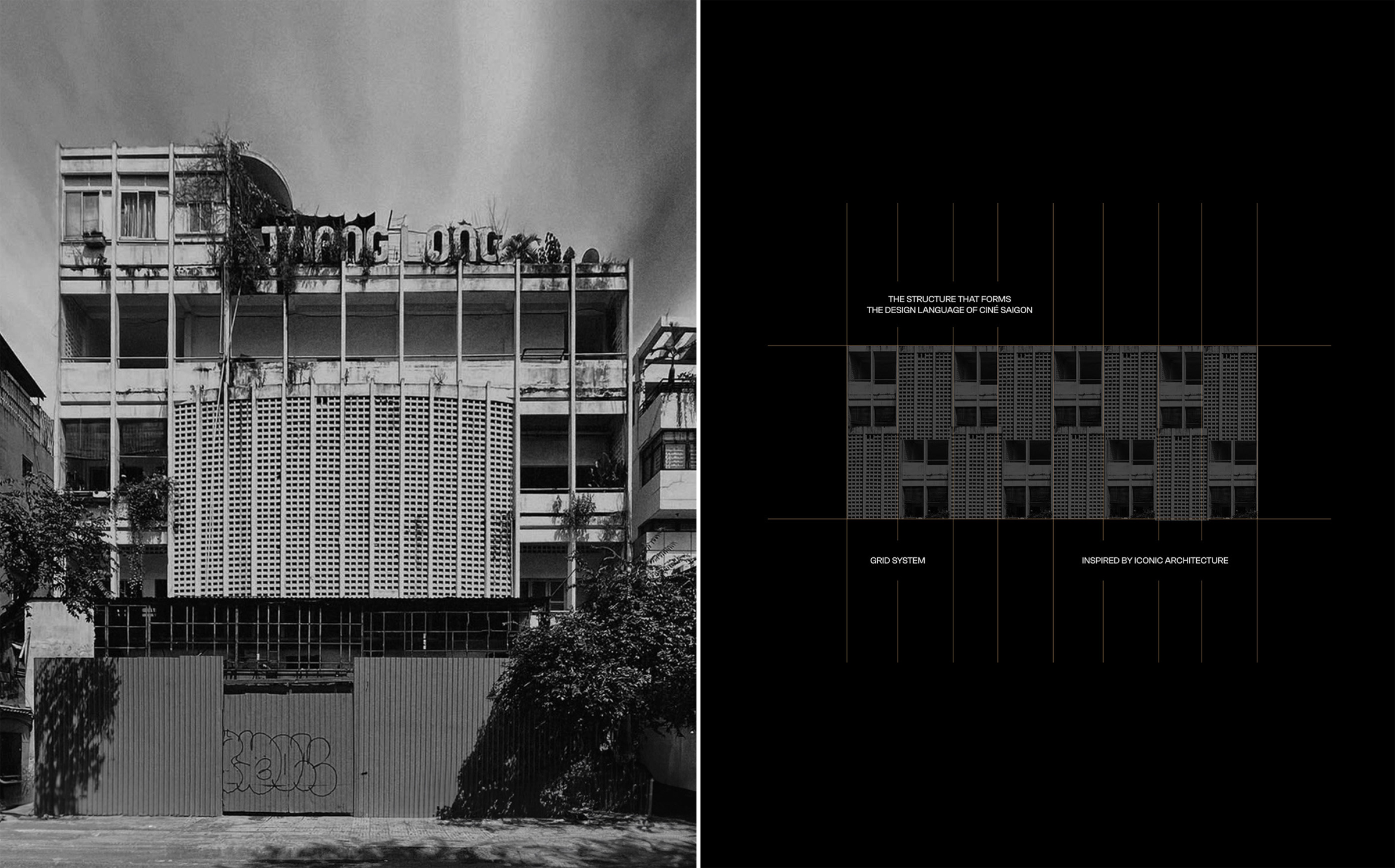 Từ Logo, hệ thống màu sắc và kiểu chữ tuỳ chỉnh được thiết kế dựa trên những cấu trúc vững chắc và tỷ lệ cân đối, mang lại sự hiện đại nhưng vẫn tôn vinh di sản lịch sử. Bố cục tổng thể trong các ứng dụng nhận diện sử dụng các trục và module này để tạo sự nhất quán, dễ nhận diện và thể hiện tính nghệ thuật trong thiết kế. Từ đó giúp hình ảnh nhận diện của Ciné Saigon vừa duy trì được tính di sản, vừa phát triển theo hướng sáng tạo và hiện đại.